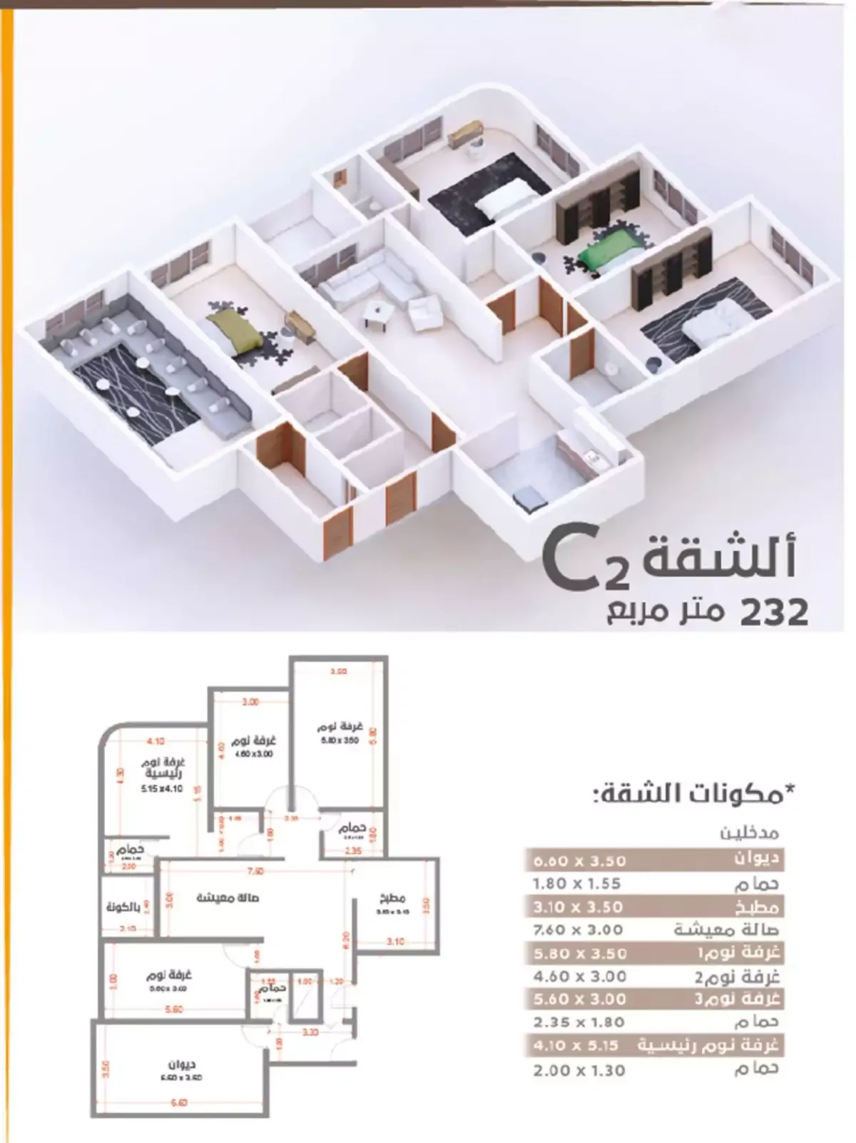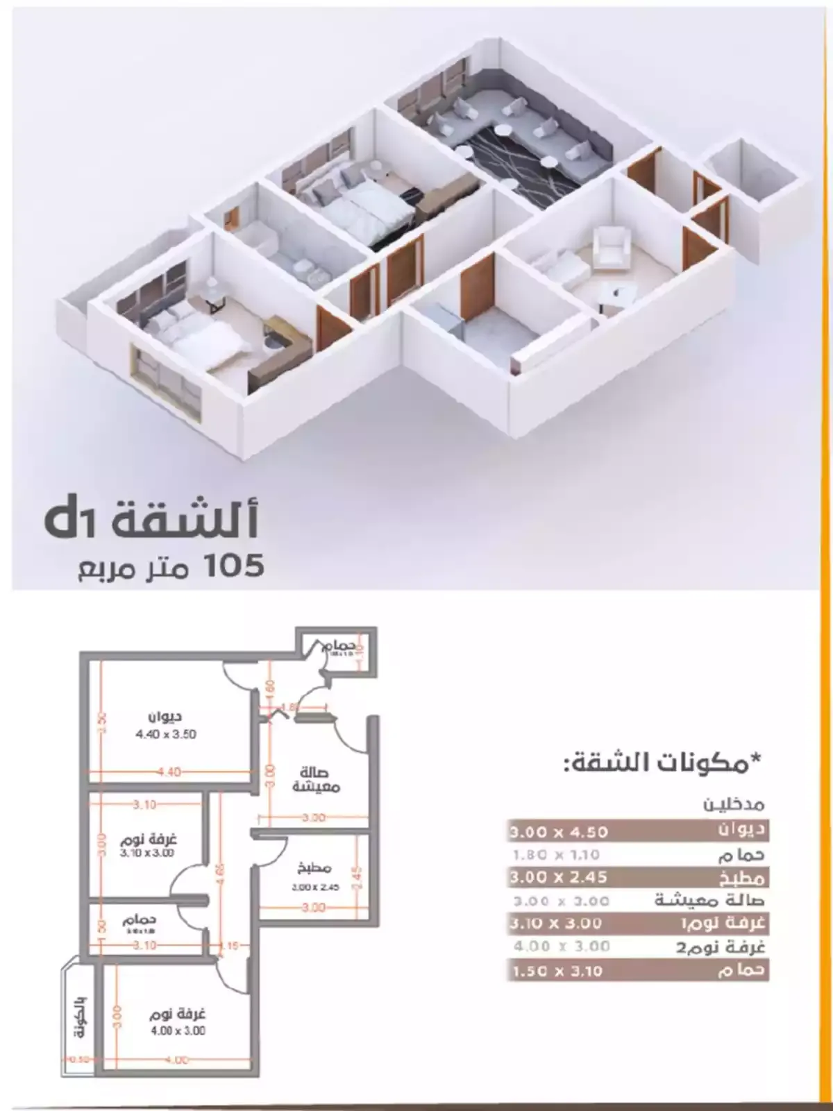 • مساحات تبدأ من 105 متر مربع إلى 263متر مربع.